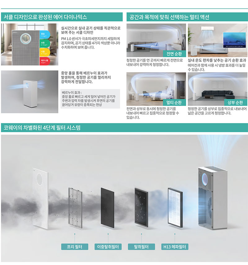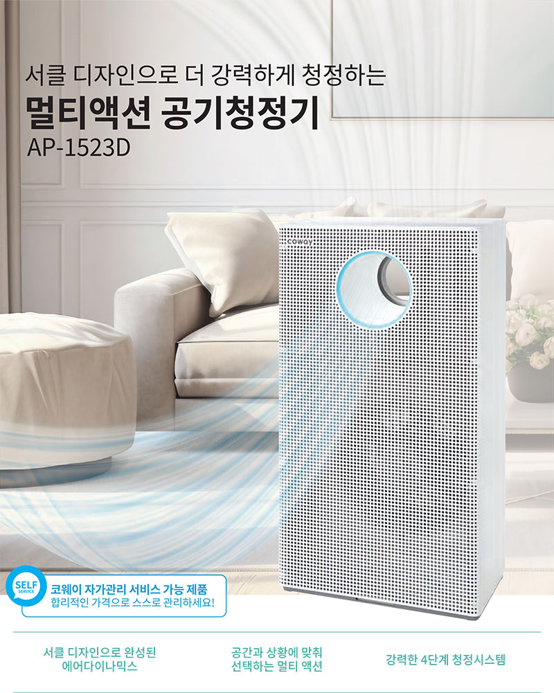 코웨이 공기청정기 AP-1523D는 트루 헤파필터를 장착하여 극초미세먼지 제거, 자동 풍량 조절, 에너지 절약 스마트 에코 모드, 편리한 필터 관리 기능을 제공하여 쾌적한 실내 환경을 유지합니다.